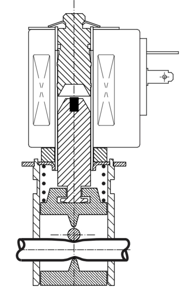 Нормально закрытый соленоидный клапан, пережимающий трубку — это клапан, который при отсутствии напряжения на его индукционной катушке закрыт для потока рабочей среды через трубку. При подаче напряжения на катушку магнитный клапан этого типа освобождает трубку и остается в таком положении все время, пока напряжение подается на катушку. При обрыве провода управляющего напряжения клапан будет закрыт.