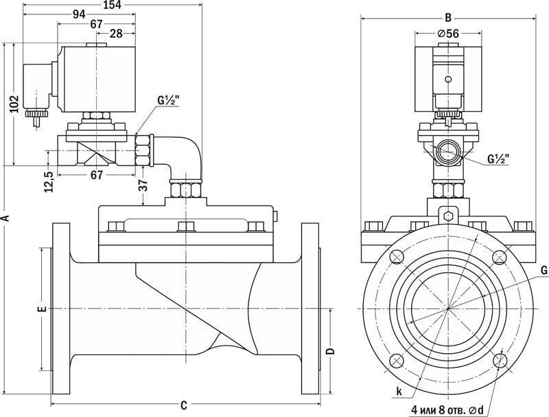 - При отсутствии напряжения на катушке клапан закрыт; при подаче напряжения на катушку фланцевый клапан открывается, при этом часть воды выбрасывается через пилотный клапан