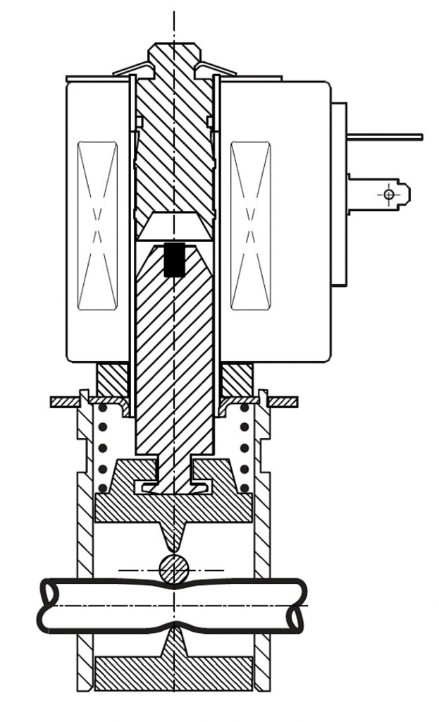 Соленоидный клапан, пережимающий две трубки (верхняя нормально закрытая, нижняя нормально открытая) — это клапан, который при отсутствии напряжения на его индукционной катушке закрыт для потока рабочей среды через верхнюю трубку и открыт для потока рабочей среды через нижнюю. При подаче напряжения на катушку магнитный клапан этого типа пережимает нижнюю трубку и освобождает верхнюю и остается в таком положении все время, пока напряжение подается на катушку. При обрыве провода управляющего напряжения верхняя трубка закрыта, нижняя – открыта.