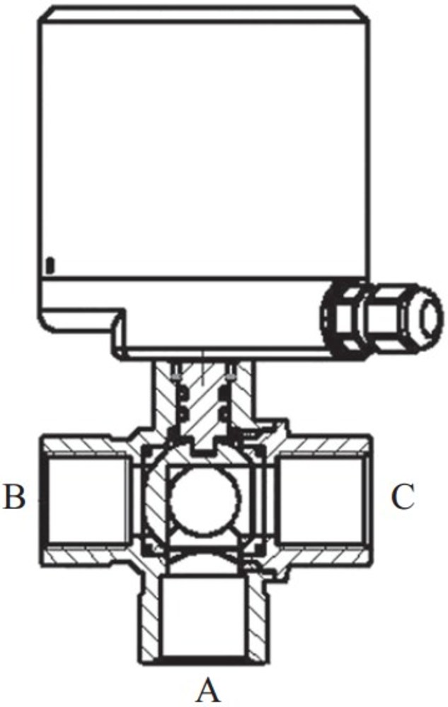 - Привод оснащен указателем крайних положений крана (положение 1: открыт путь A-B, положение 2: открыт путь А-C)