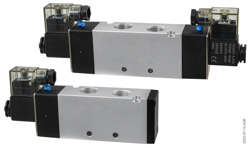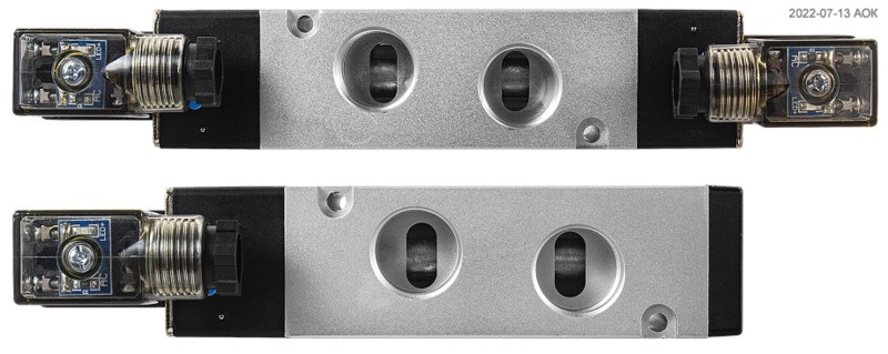Бистабильный: при подаче питания на первую катушку воздух подается через порт питания P на рабочий порт А, при этом рабочий порт В соединен с портом выхлопа S. При снятии питания золотник остается в том же положении. При подаче питания на вторую катушку порт питания Р переключается на рабочий порт В, а рабочий порт А соединяется с портом выхлопа R. При снятии питания золотник остается в том же положении.