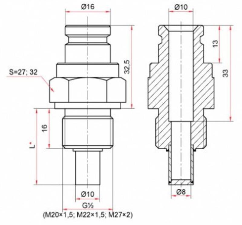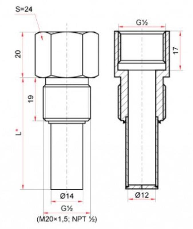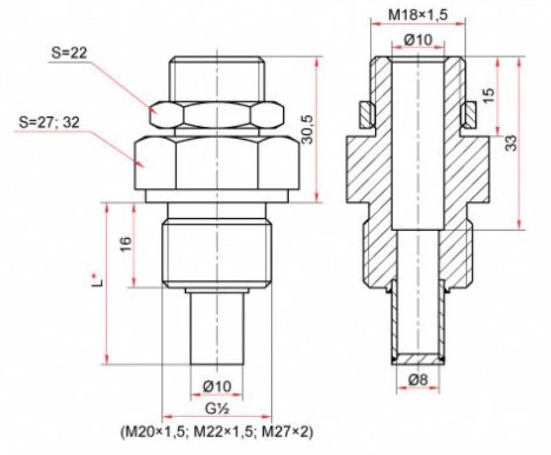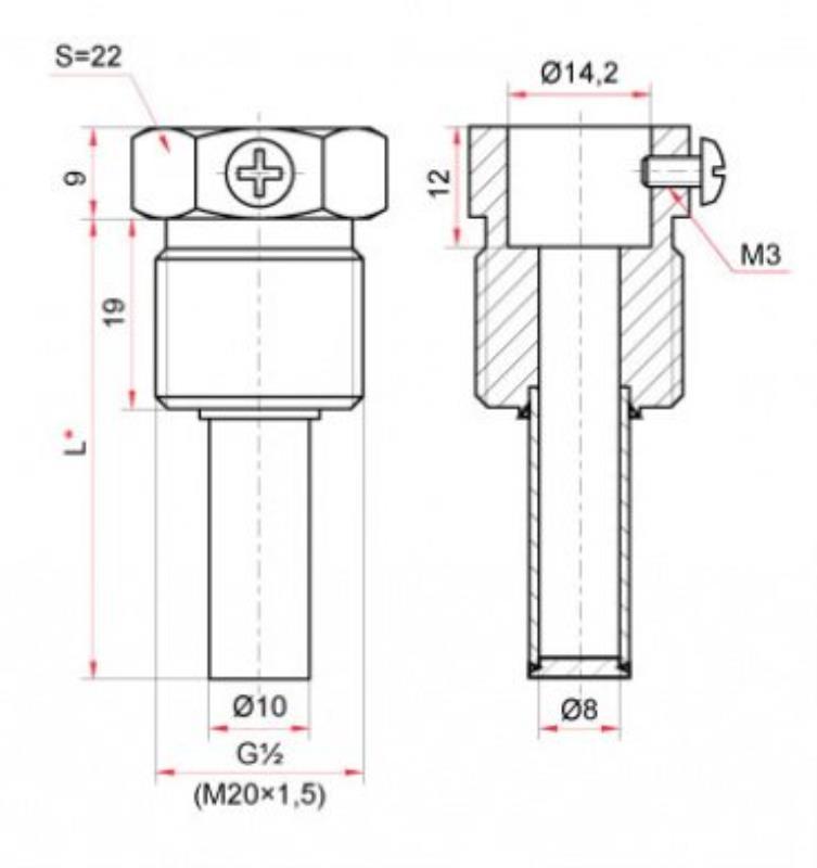 При заказе гильз из нержавеющей стали необходимо указать тип и серию термометра, наружную резьбу гильзы и длину погружной части гильзы (L).