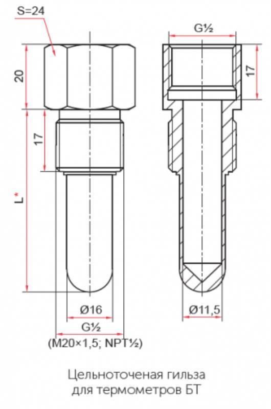 При заказе гильз из нержавеющей стали необходимо указать тип и серию термометра, наружную резьбу гильзы и длину погружной части гильзы (L).